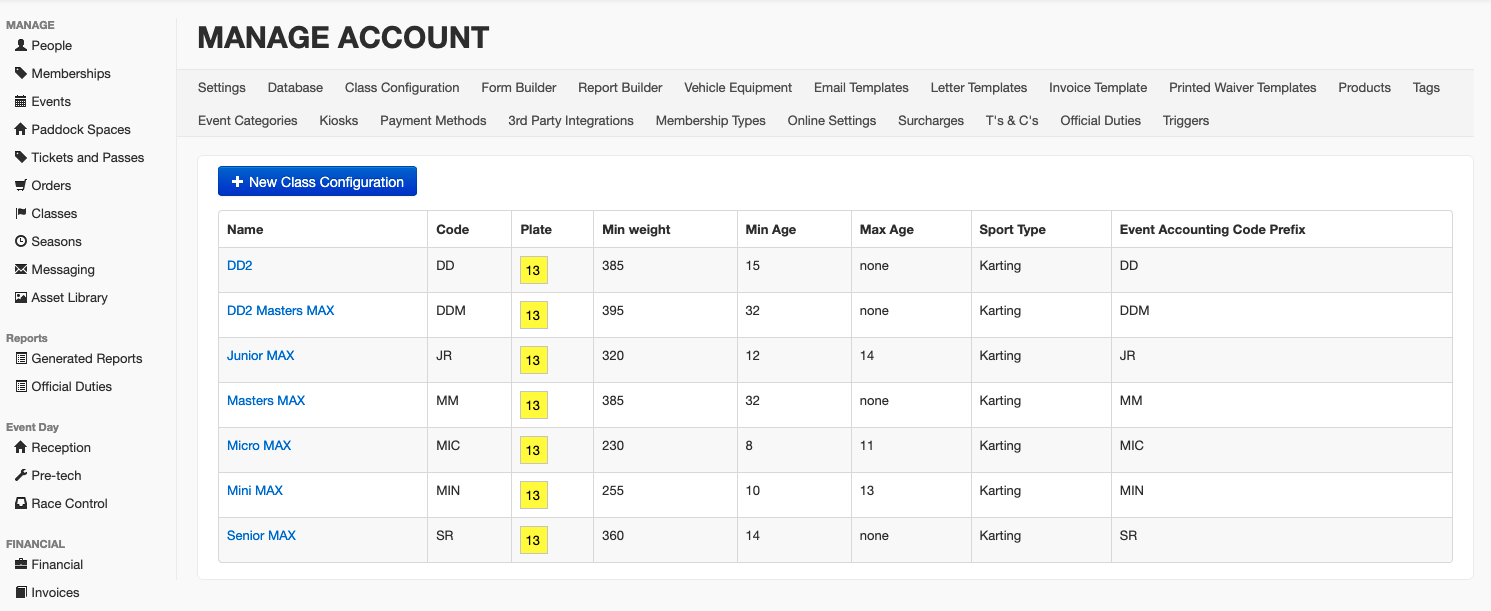 You can set the appearance of the number plate for the class, the default engine and tyres and the minimum/maximum age and weight requirements. These are purely a guide for yourself though and are not public facing.