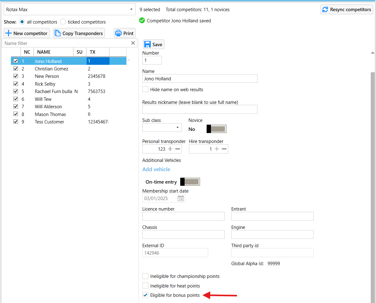Bonus points can also be awarded to competitors who started any session in the specified round and have bonus points enabled for their Competitor Profile (see the competitors screen for that round).