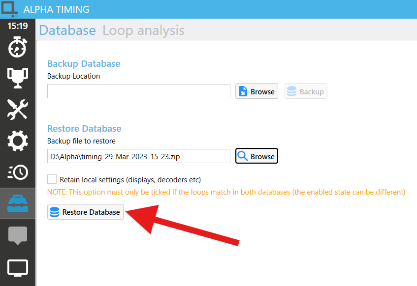 IMPORTANT: Before this, you will need to create a back up of the Timing Database from the old timing PC and transfer it to the new PC. You must then ensure that you do not use the Timing PC during this process and that the Alpha Timing application is removed from the old timing PC, and only installed and used on the new timing PC, otherwise the timing database will become out of sync.