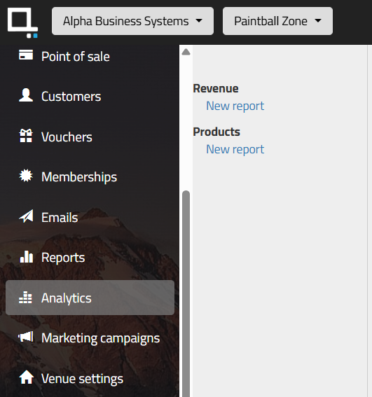The Analytics module is used to track and visualise your total revenue or product revenue over a specified time period. You can also compare your selected time period against another selected time period. To create a report, click the New report button under your preferred report.