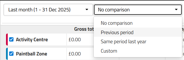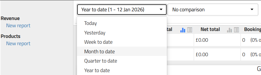 Set your time frame using the left dropdown to select your primary date range and the right dropdown to select a second time period to compare against your primary range, exactly as you would in the Revenue Report. Periods that can be shown are: