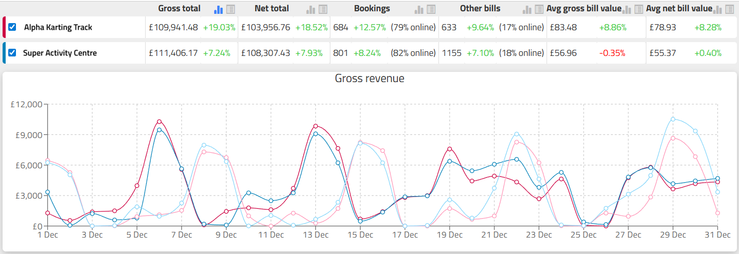 If you manage multiple venues, you can filter by selecting the required venue. The graphs will use color-coding (indicated next to the venue name) to differentiate between them.