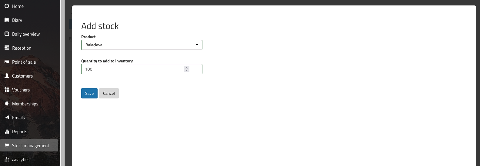 Click 'Save' to add your stock to the inventory for a product. The Stock management screen will an updated value for 'Current' with your new stock levels.