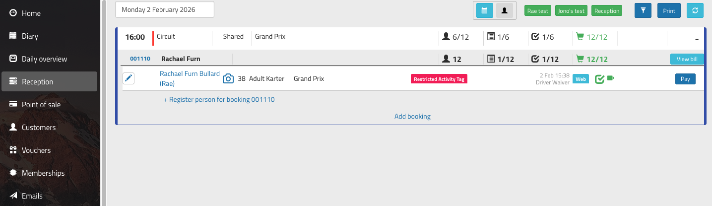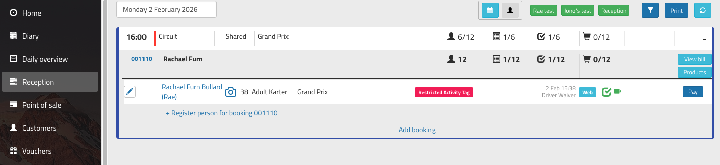 The Reception screen highlights (with a shopping cart icon) how many products are on a bill, and how many of those products have been given out.
