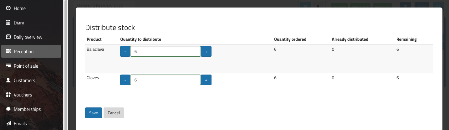 Enter the number of products that are being given out, and click 'Save'. The system will update accordingly, and if all the products have been given out, the icon will turn green: